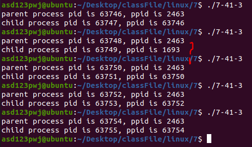 如下图,第二次运行这段程序时,子进程的ppid不再是父进程,但父进程的ppid却始终是终端pid