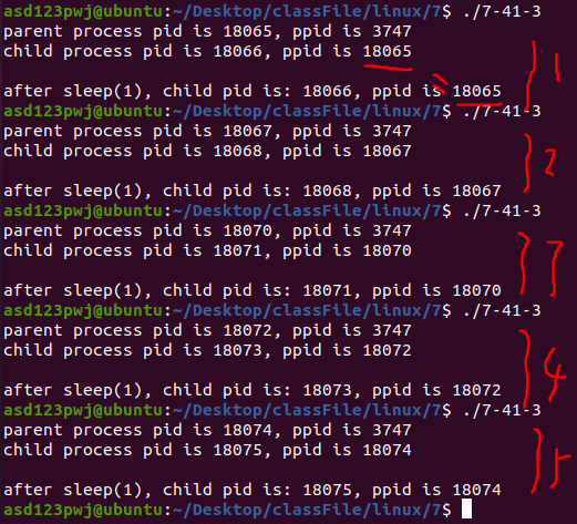 printf("\nafter sleep(1), child pid is: %d, ppid is %d\n", getpid(), getppid());