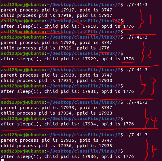 可以看出,在使用sleep(1)后,child ppid每次都是1776,而不是父进程pid